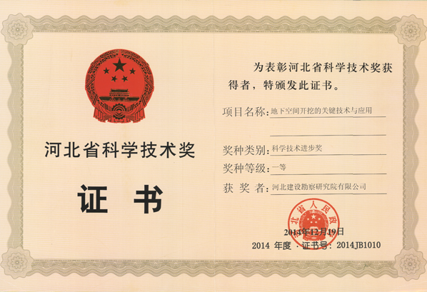 2015年2月26日,省委、省政府在石家莊召開(kāi)全省科技創(chuàng)新暨科學(xué)技術(shù)獎(jiǎng)勵(lì)大會(huì),省委書記、省人大常委會(huì)主任周本順,省委副書記、省長(zhǎng)張慶偉出席會(huì)議并講話。會(huì)上,副省長(zhǎng)許寧宣讀了省政府關(guān)于2014年度河北省科學(xué)技術(shù)獎(jiǎng)勵(lì)的決定,公布了獲獎(jiǎng)項(xiàng)目(人員)名單。我公司申報(bào)的項(xiàng)目“地下空間開(kāi)挖的關(guān)鍵技術(shù)與應(yīng)用”榮獲2014年度河北省科學(xué)技術(shù)進(jìn)步獎(jiǎng)一等獎(jiǎng)。