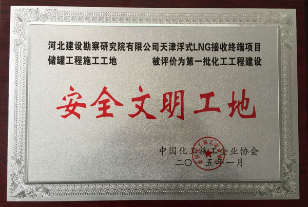 近日,我公司天津浮式LNG接收終端項(xiàng)目?jī)?chǔ)罐工程施工工地被中國(guó)化工施工企業(yè)協(xié)會(huì)評(píng)為安全文明工地。