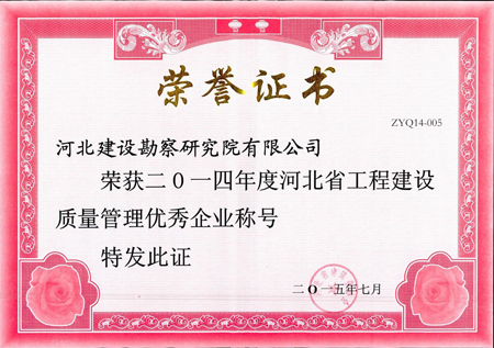近日,根據河北省建筑業協會冀建協字[2105]25號文《關于繼續開展河北省工程建設質量管理優秀企業評選表彰活動的通知》,我公司榮獲“二〇一四年度河北省工程建設質量管理優秀企業稱號”。