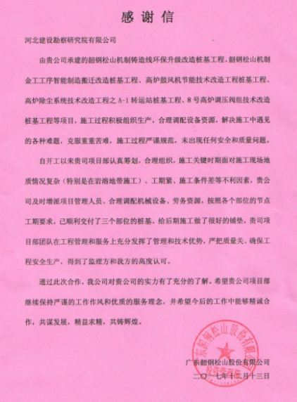 由我公司施工的韶鋼煤氣高效綜合循環(huán)利用改建工程,克服了施工過(guò)程中的各項(xiàng)難題,已順利交付三個(gè)部位樁基,得到了廣東韶鋼松山股份有限公司的高度認(rèn)可,特向公司發(fā)來(lái)感謝信。