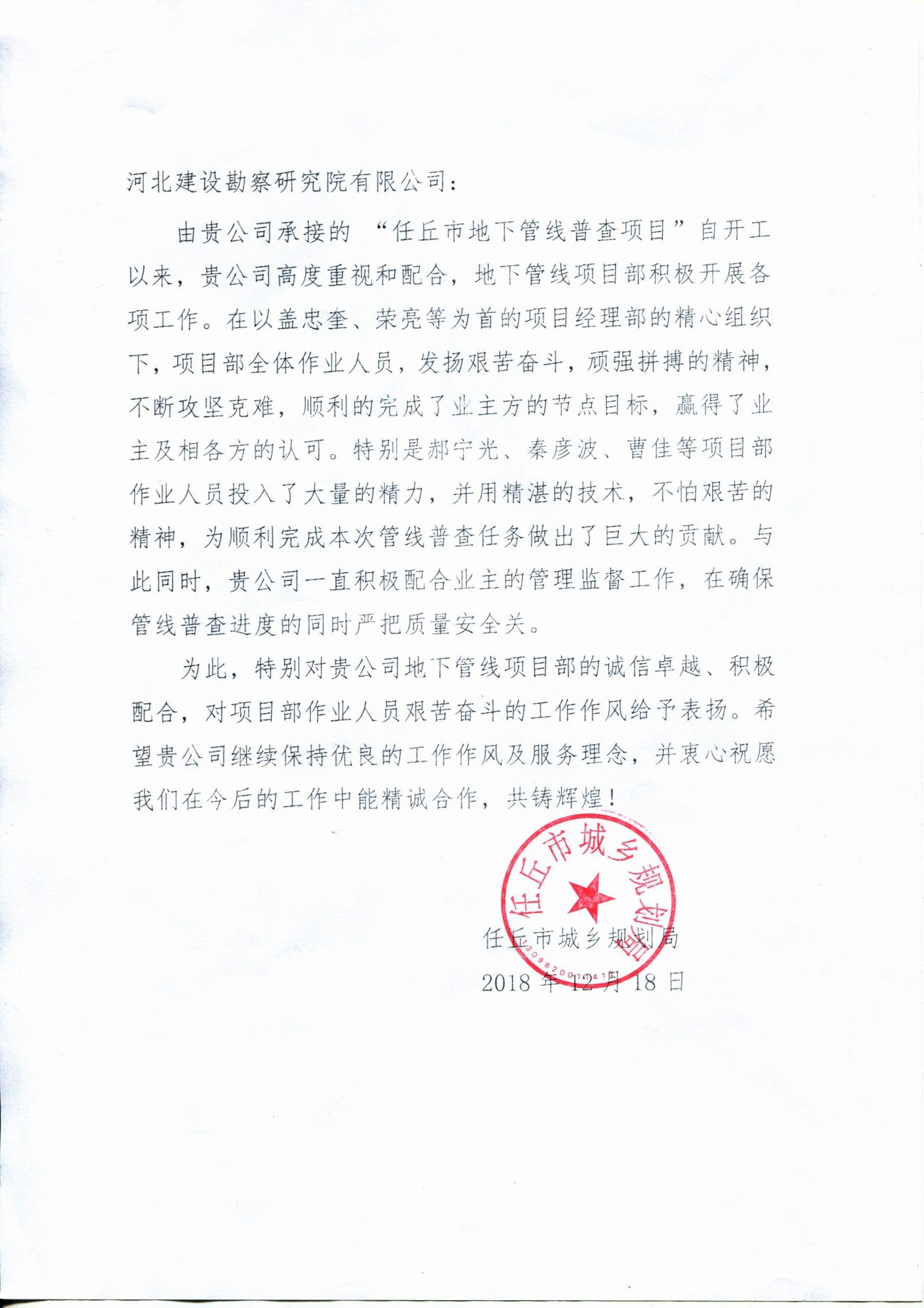 近日,公司收到辛集市城鄉規劃局和任丘市城鄉規劃局發來的表揚信,分別對我公司誠信卓越、積極配合及項目部作業人員艱苦奮斗的工作作風給予表揚。特別是在任丘地下管線普查項目中,在以蓋忠奎、榮亮為代表的項目部精心組織下,項目全體作業人員,發揚艱苦奮斗、頑強拼搏的精神,不斷攻堅克難,保質保量提前完成了生產任務,贏得了業主的認可。甲方特發來表揚信,對我公司所作出的貢獻表示感謝!并希望我們繼續保持優良的工作作風及服務理念,精誠合作,共創輝煌!