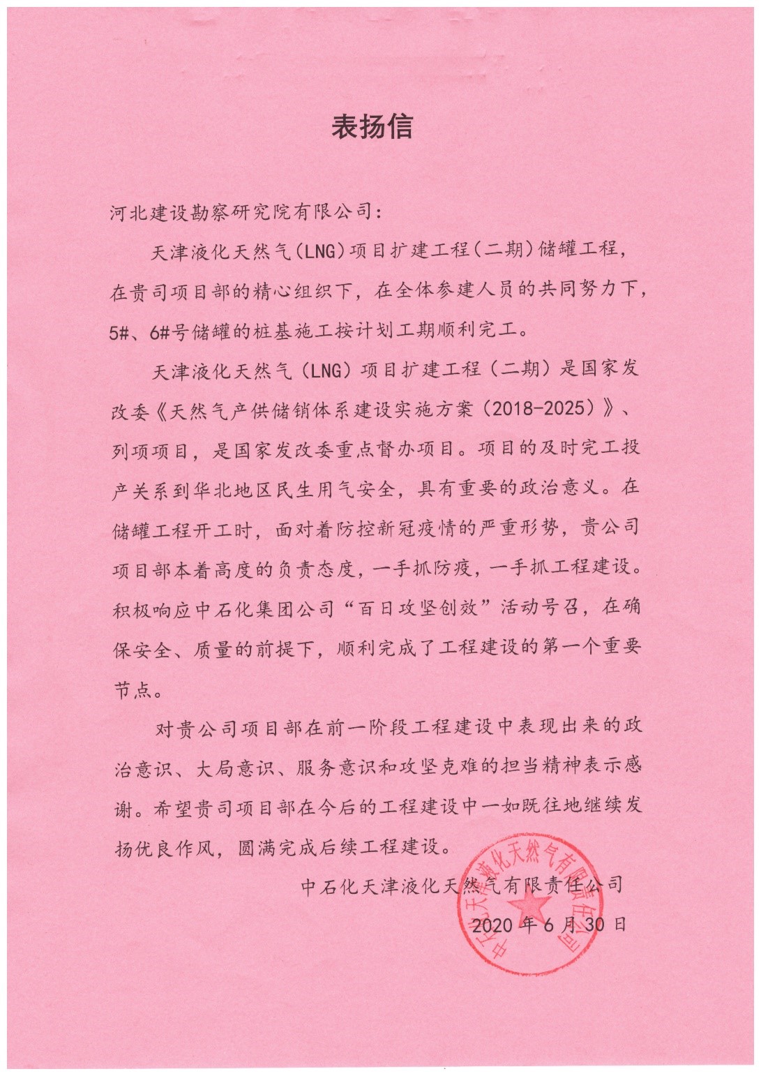 公司承建的天津液化天然氣(LNG)項(xiàng)目擴(kuò)建工程(二期)5#6#罐樁基工程,自2020年4月5日正式開工,歷經(jīng)83個(gè)日夜的奮戰(zhàn),最終于2020年6月26日優(yōu)質(zhì)、高效、圓滿的完成了5#6#罐的樁基施工任務(wù)。中石化天津液化天然氣有限責(zé)任公司,對(duì)我公司中石化天津LNG二期項(xiàng)目部提出表?yè)P(yáng),表?yè)P(yáng)我公司領(lǐng)導(dǎo)及全體項(xiàng)目施工人員對(duì)項(xiàng)目高度負(fù)責(zé)的態(tài)度,一手抓防疫,一手抓工程建設(shè),積極響應(yīng)中石化集團(tuán)公司“百日攻堅(jiān)創(chuàng)效”活動(dòng)號(hào)召,在確保安全、質(zhì)量的前提下,順利完成了工程建設(shè)的第一個(gè)重要節(jié)點(diǎn)。同時(shí)對(duì)我公司在前一階段工程建設(shè)中表現(xiàn)出來(lái)的政治意識(shí)、大局意識(shí)、服務(wù)意識(shí)和攻堅(jiān)克難的擔(dān)當(dāng)精神表示感謝。希望我公司在今后的工程建設(shè)中一如既往地繼續(xù)發(fā)揚(yáng)優(yōu)良作風(fēng),圓滿完成后續(xù)工程建設(shè)。