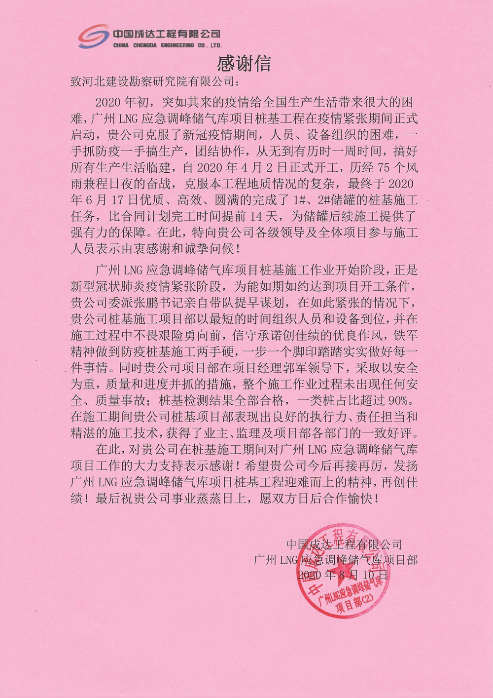 近日,我公司廣州LNG應(yīng)急調(diào)峰儲(chǔ)氣庫項(xiàng)目收到成達(dá)公司發(fā)放的感謝信。廣州LNG應(yīng)急調(diào)峰項(xiàng)目是我公司首次在LNG行業(yè)打入廣州市場,也是首次和中國成達(dá)工程公司進(jìn)行合作,項(xiàng)目部全體員工發(fā)揚(yáng)公司的鐵軍精神做到防疫施工兩手硬,不畏艱險(xiǎn)勇向前,齊心協(xié)力、積極策劃,圓滿的完成了各項(xiàng)任務(wù),為廣州LNG應(yīng)急調(diào)峰項(xiàng)目順利實(shí)施打下良好的基礎(chǔ);在施工中,項(xiàng)目安全生產(chǎn)管理到位,質(zhì)量工藝管控優(yōu)良,贏得了業(yè)主、監(jiān)理及相關(guān)各方高度認(rèn)可。對(duì)全體參建本項(xiàng)目的領(lǐng)導(dǎo)與員工表示了衷心的感謝,并希望在后續(xù)的工程建設(shè)中,繼續(xù)發(fā)揚(yáng)河北建勘的優(yōu)良工作作風(fēng)!