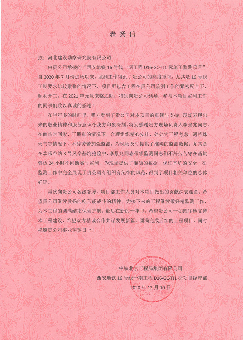 近日,公司收到中鐵北京工程局集團有限公司西安地鐵16號線一期工程D16-GC-TJ1標(biāo)項目經(jīng)理部的表揚信。