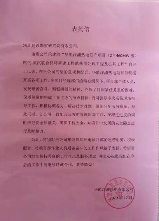 華能洋浦熱電聯產項目(2×460MW級)燃氣-蒸汽聯合循環新建工程地基預處理工程及樁基工程自開工以來,積極開展各項工作,精心組織,克服了時間緊任務重的困難,保質保量完成了節點目標。特對項目部的吃苦耐勞、積極配合,對項目部作業人員艱苦奮斗的工作作風給予表揚。