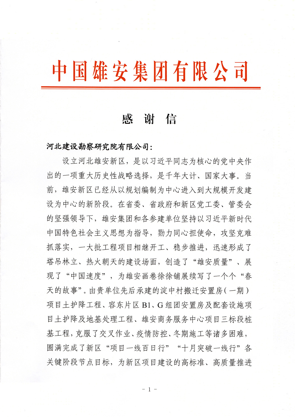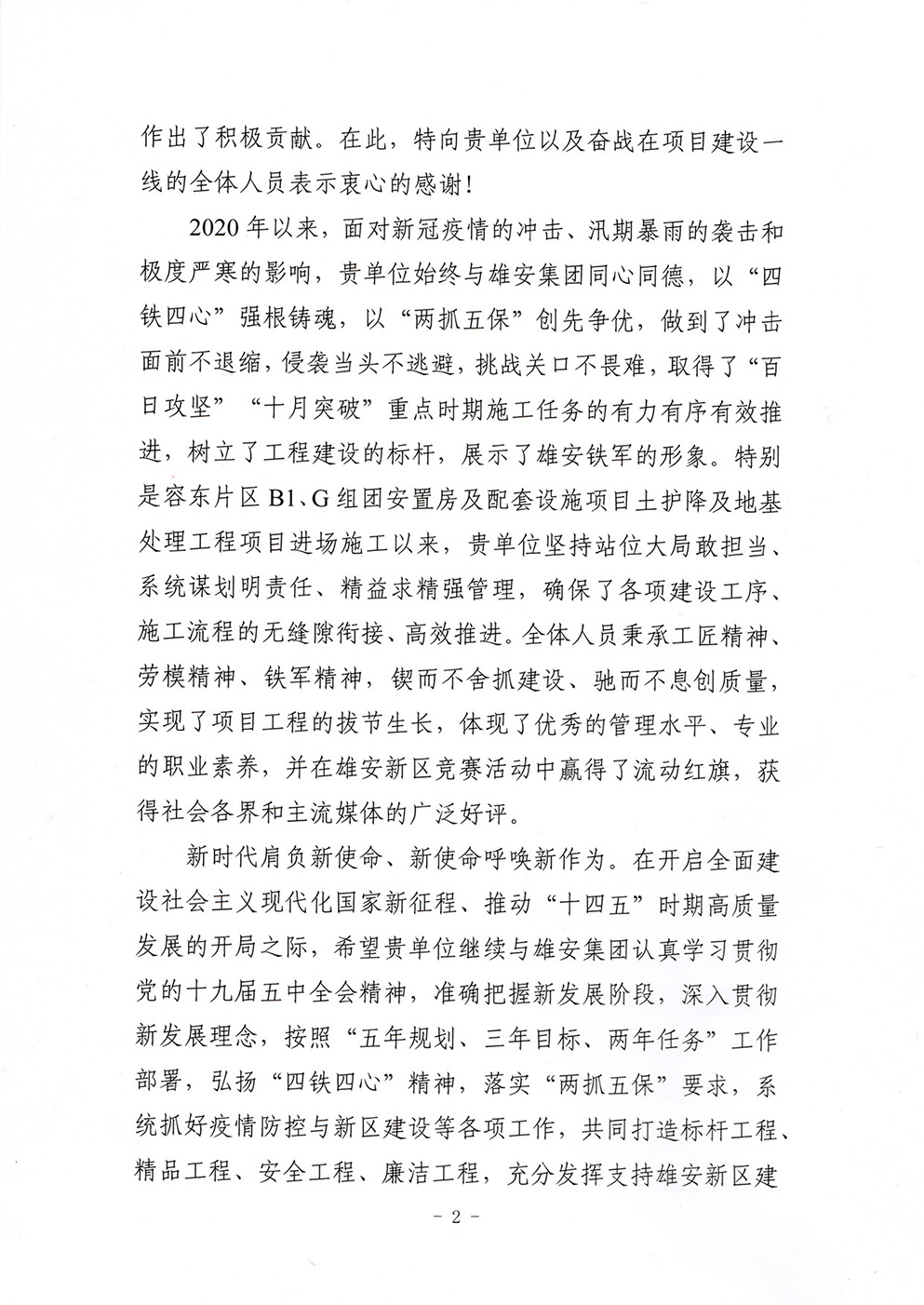 近日,公司收到中國雄安集團有限公司發(fā)來的感謝信。感謝我公司先后承建的淀中村搬遷安置房(一期)項目土護(hù)降工程、容東片區(qū)B1、G組團安置房及配套設(shè)施項目土護(hù)降及地基處理工程、雄安商務(wù)服務(wù)中心項目三標(biāo)段樁基工程,在施工過程中,堅持站位大局敢擔(dān)當(dāng)、系統(tǒng)謀劃明責(zé)任、精益求精強管理,確保了各項建設(shè)工序、施工流程的無縫銜接、高效推進(jìn)。全體人員秉承工匠精神、勞模精神、鐵軍精神,鍥而不舍抓建設(shè)、馳而不息創(chuàng)質(zhì)量,實現(xiàn)了項目工程的拔節(jié)生長,體現(xiàn)了優(yōu)秀的管理水平、專業(yè)的職業(yè)素養(yǎng),并在雄安新區(qū)競賽活動中贏得了流動紅旗,獲得社會各界和主流媒體的廣泛好評。