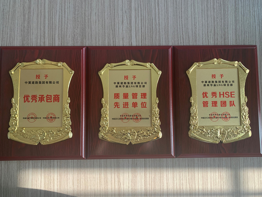 近日,由我公司承建的潮州華瀛液化天然氣接收站項目儲罐工程樁基施工項目,榮獲華瀛天然氣股份有限公司和中國五環工程有限公司潮州華瀛LNG項目部頒發的“優秀承包商”、“質量管理先進單位”和“優秀HSE管理團隊”的榮譽獎牌以及感謝信。