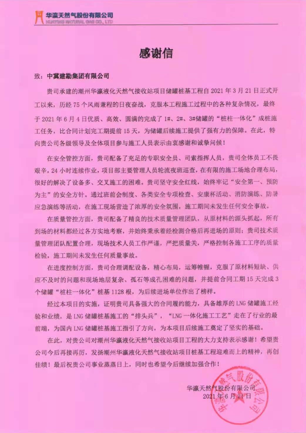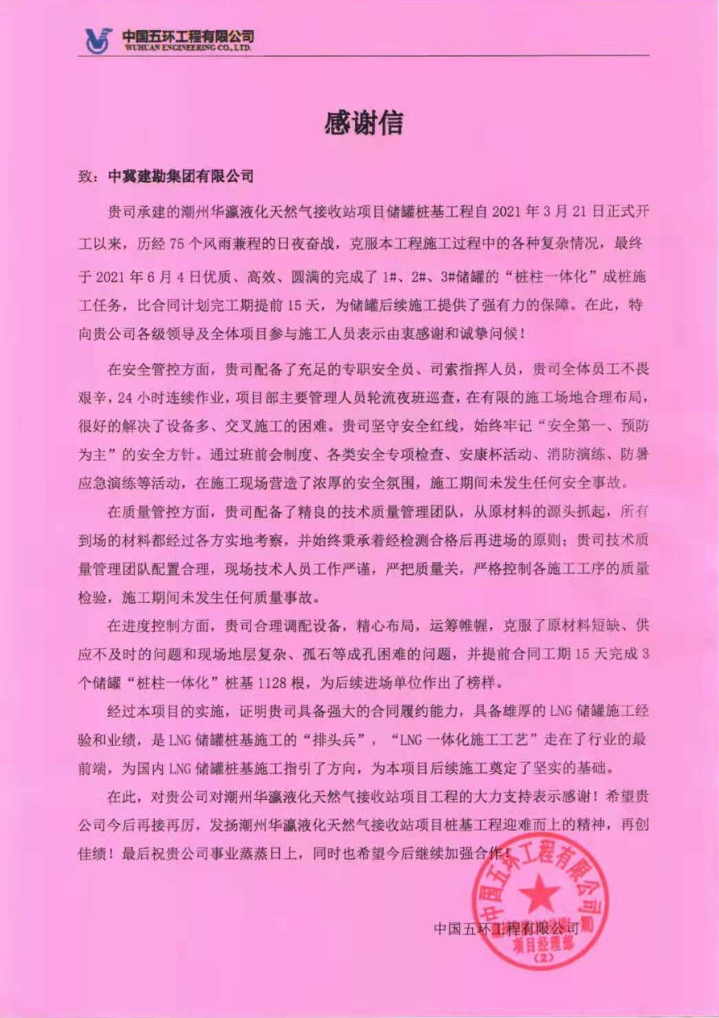 我項目部施工期間正值年初建筑市場復蘇原材料全面漲價階段,面對現場原材價格不斷上漲且供應不足的問題,非常感謝總公司及各位領導的大力支持;面對設備多、工期緊,任務重,我公司潮州華瀛LNG項目部,充分發揚能吃苦、能戰斗的精神,提前謀劃,合理組織、精心安排,積極配合業主進度計劃,保質保量的比合同工期提前15日完成所有樁基施工任務。我單位在安全管理、施工質量管理方面為建設方、監理方、總包方留下深刻影響,為此項目部得到了中國五環工程有限公司潮州華瀛LNG項目經理部以及華瀛天然氣股份有限公司高度認可!