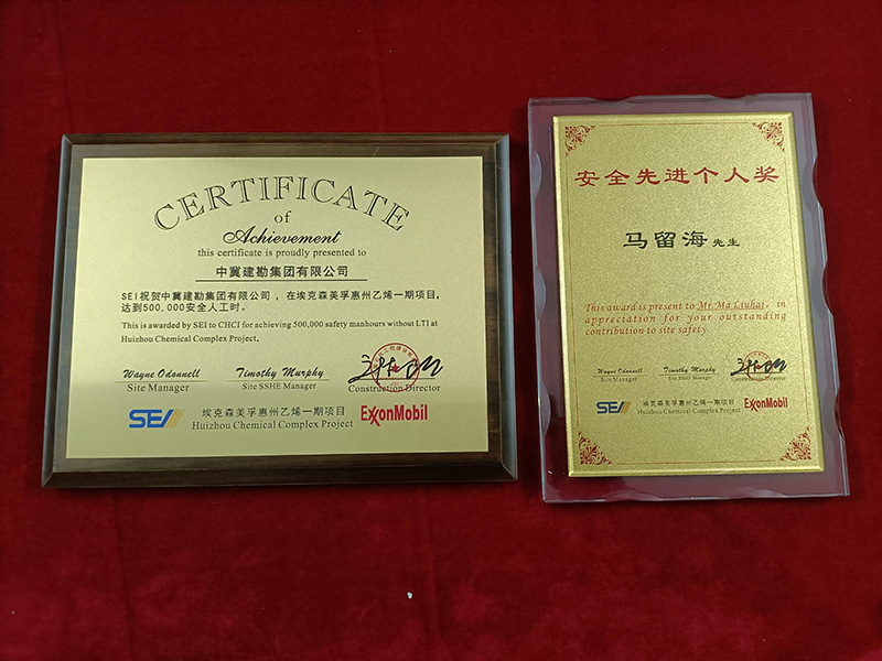 近日,我公司承建的埃克森美孚惠州乙烯一期項目強夯工程,榮獲“達到500000安全人工時”優秀團隊獎,馬留海榮獲 “安全先進個人獎”。