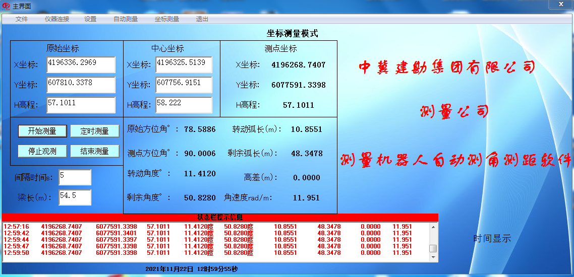 在橋梁轉體過程中,我們采用國內最先進的全自動測量機器人并結合自主研發的跟蹤測量軟件,對橋梁實施運行軌跡和震動監控監測。在轉體過程中嚴格控制轉體橋轉體角速度,并對軸線合攏進行測量,指揮施工單位對轉體橋進行點動,最終達到設計要求,本次軸線合攏精度達到5mm,滿足設計要求。