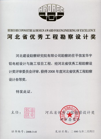 茌平信發華宇鋁電樁基設計與施工項目獲河北省優秀工程勘察設計三等獎。