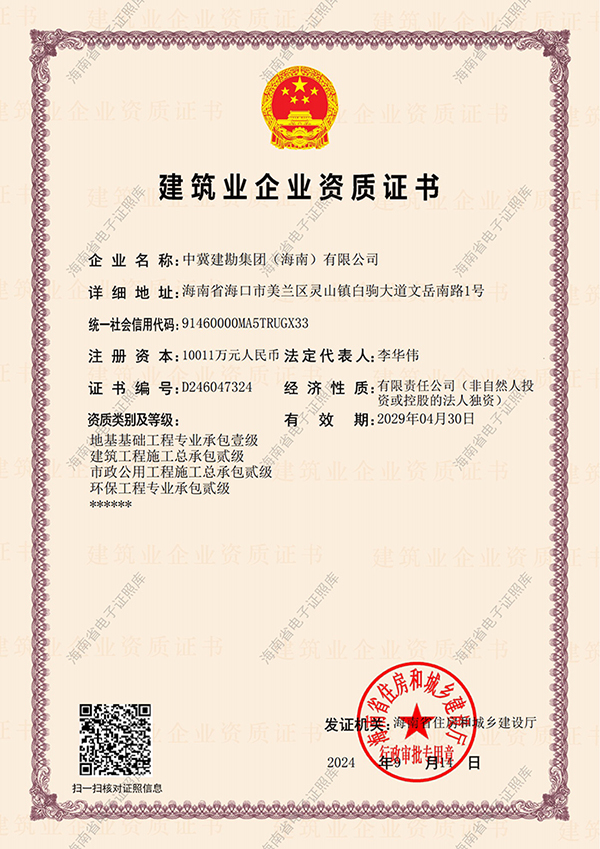 按照公司發(fā)展規(guī)劃,經(jīng)過(guò)近半年的努力,海南公司于2024年9月14日通過(guò)海南省住建廳審查,成功將地基與基礎(chǔ)工程專(zhuān)業(yè)承包貳級(jí)晉升為壹級(jí)。此項(xiàng)壹級(jí)資質(zhì)的取得,是海南公司資質(zhì)實(shí)力質(zhì)的飛躍,為海南公司持續(xù)發(fā)展,為公司實(shí)施“雙總部建設(shè)”,構(gòu)建“一業(yè)為主,適度多元化發(fā)展”戰(zhàn)略打下了堅(jiān)實(shí)的基礎(chǔ)。