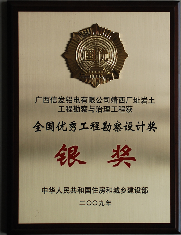 2010年7月6日,住房和城鄉建設部在北京召開2008年度全國優秀工程勘察設計獎頒獎大會,我公司“廣西信發鋁電有限公司靖西廠址巖土工程勘察與治理”項目被授予全國優秀工程勘察設計銀獎獎牌。