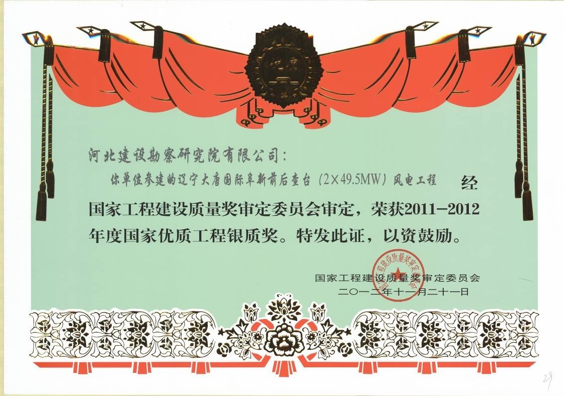 由我公司參與施工的遼寧大唐國際阜新前后查臺(2×49.5MW)風電工程被國家工程建設質量獎評定委員會評定為2011-2012年度“國家優質工程銀質獎”。