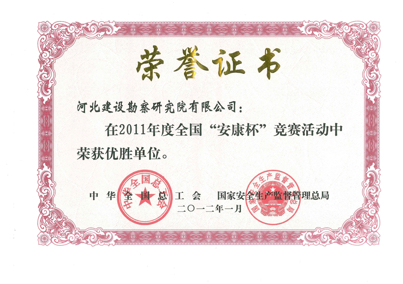 公司在2011年度“安康杯”競賽活動中,被中華全國總工會、國家安全生產(chǎn)監(jiān)督管理總局評為優(yōu)勝單位,這是我公司連續(xù)第八年獲此殊榮。