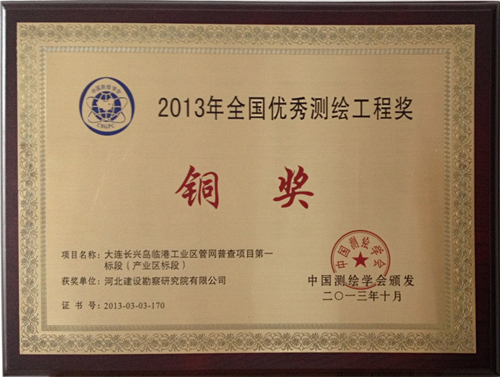 近日,由我公司完成的大連長興島臨港工業區管網普查項目第一標段(產業區標段)被中國測繪學會評為優秀測繪工程銅獎。
